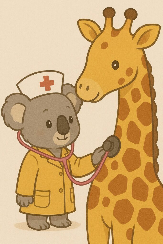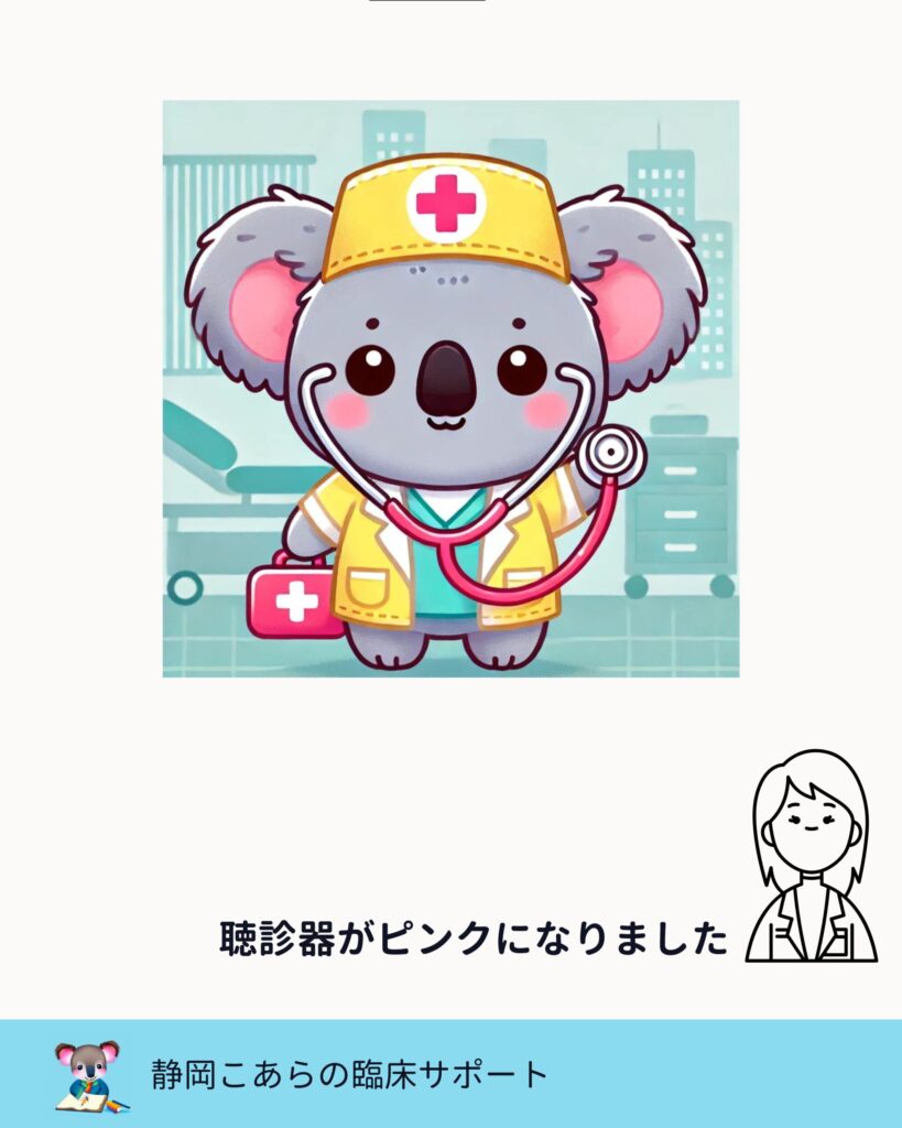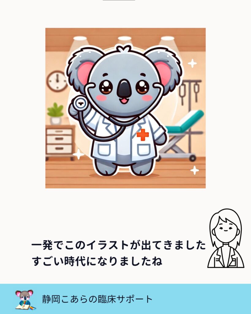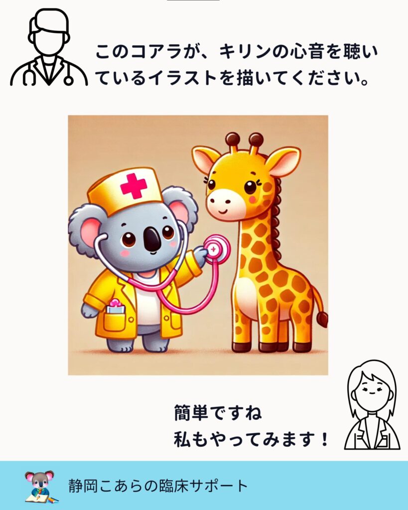 さらに、コアラがキリンの心音を聴いているイラストまで描いてくれました。医療の世界から少し離れた絵本のような雰囲気で、見ているだけで心がゆるむ。こういう柔らかい表現は、説明資料や院内教育でも意外と使い道があります。