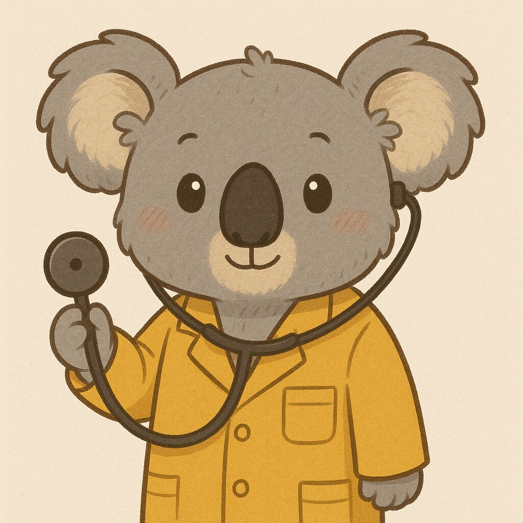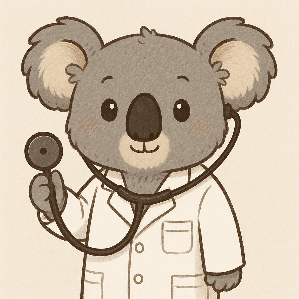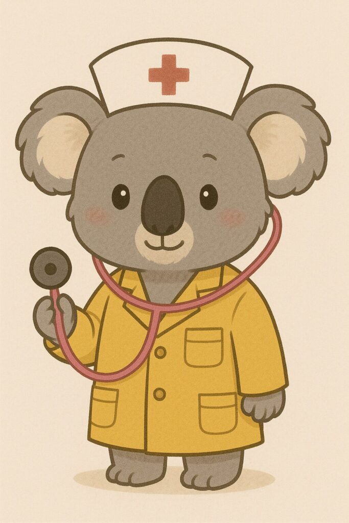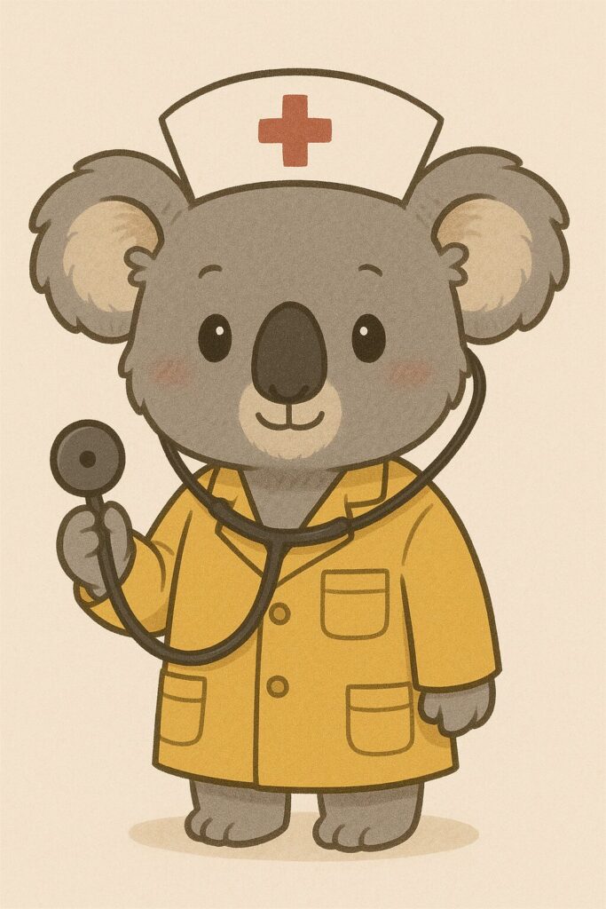 ①かわいいコアラが、白衣を着て、手に聴診器を持っているイラストを描いてください。