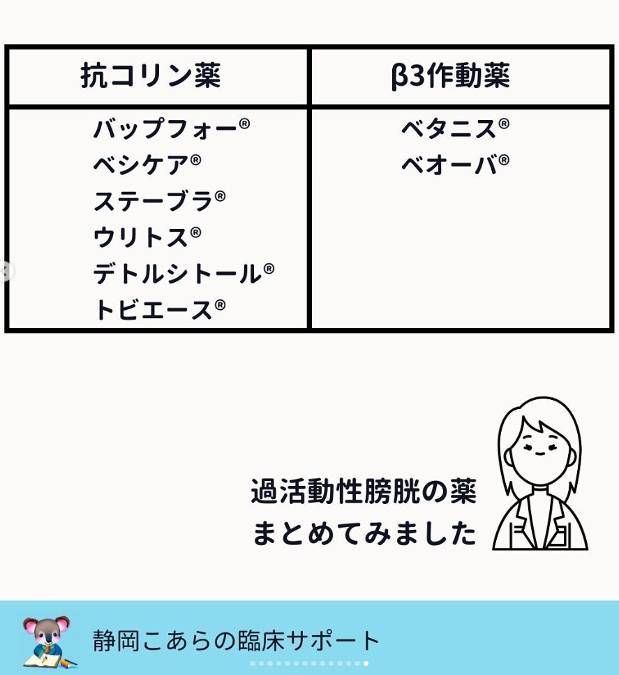 ちなみに、過活動膀胱で困っているけれど、抗コリン薬が副作用で使えない・・・そんな方もいると思います。調べてみると、過活動膀胱の薬って、「抗コリン薬」と「β3作動薬」の2種類があるそうです。