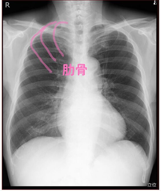 前側の肋骨は肋軟骨が多いので心臓側はあんまり写りません。