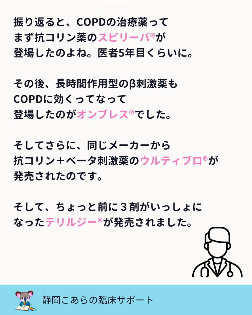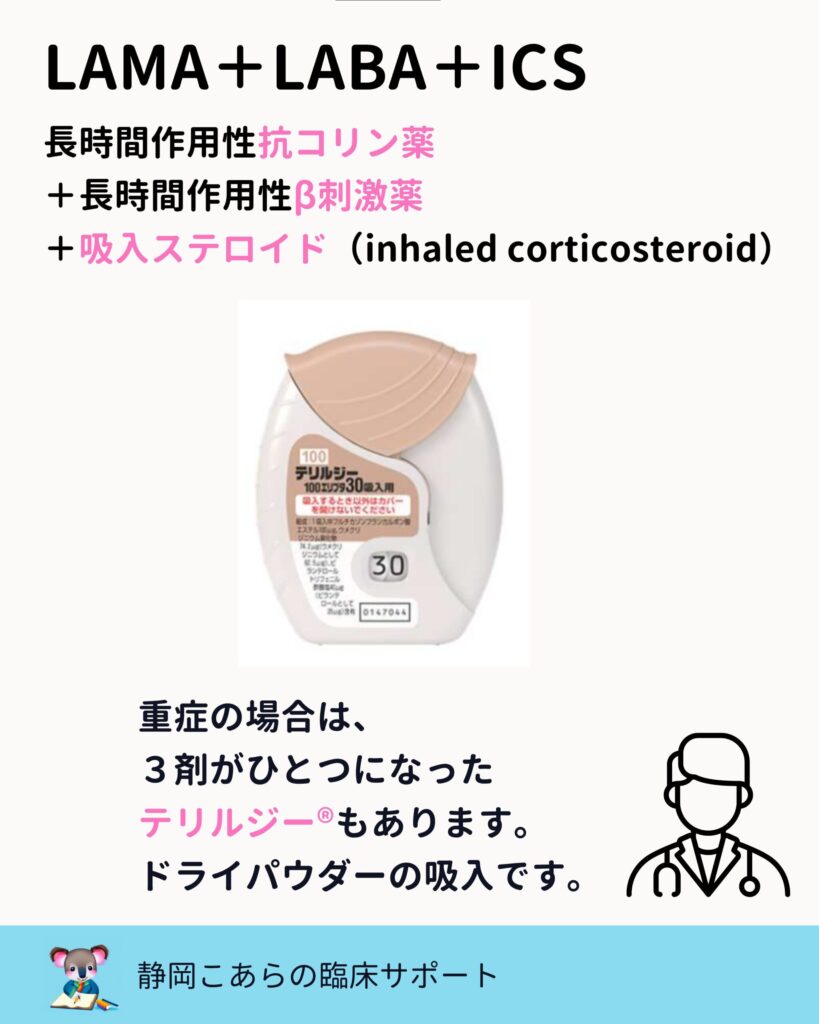 LAMA単剤から始まり、LABA併用、そして三剤配合への流れがある。