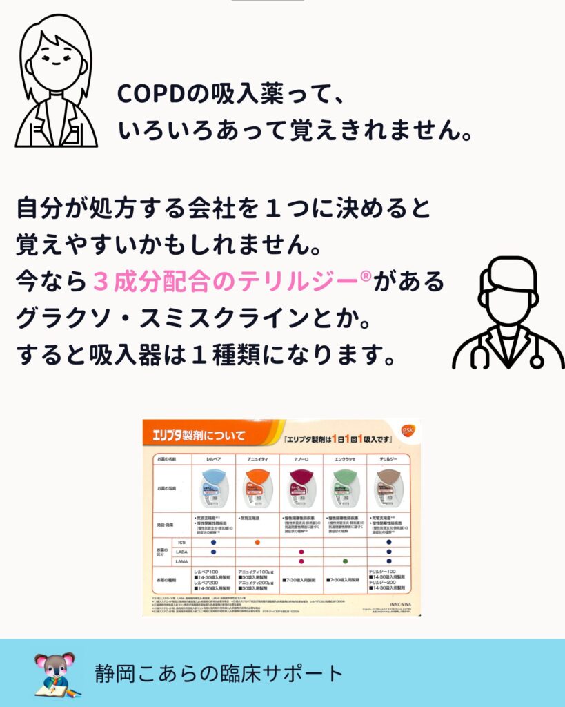 たとえば、三剤配合のテリルジー®を含むグラクソ・スミスクライン(GSK)に統一すると、吸入器も1種類で済み、指導も簡潔になります。
