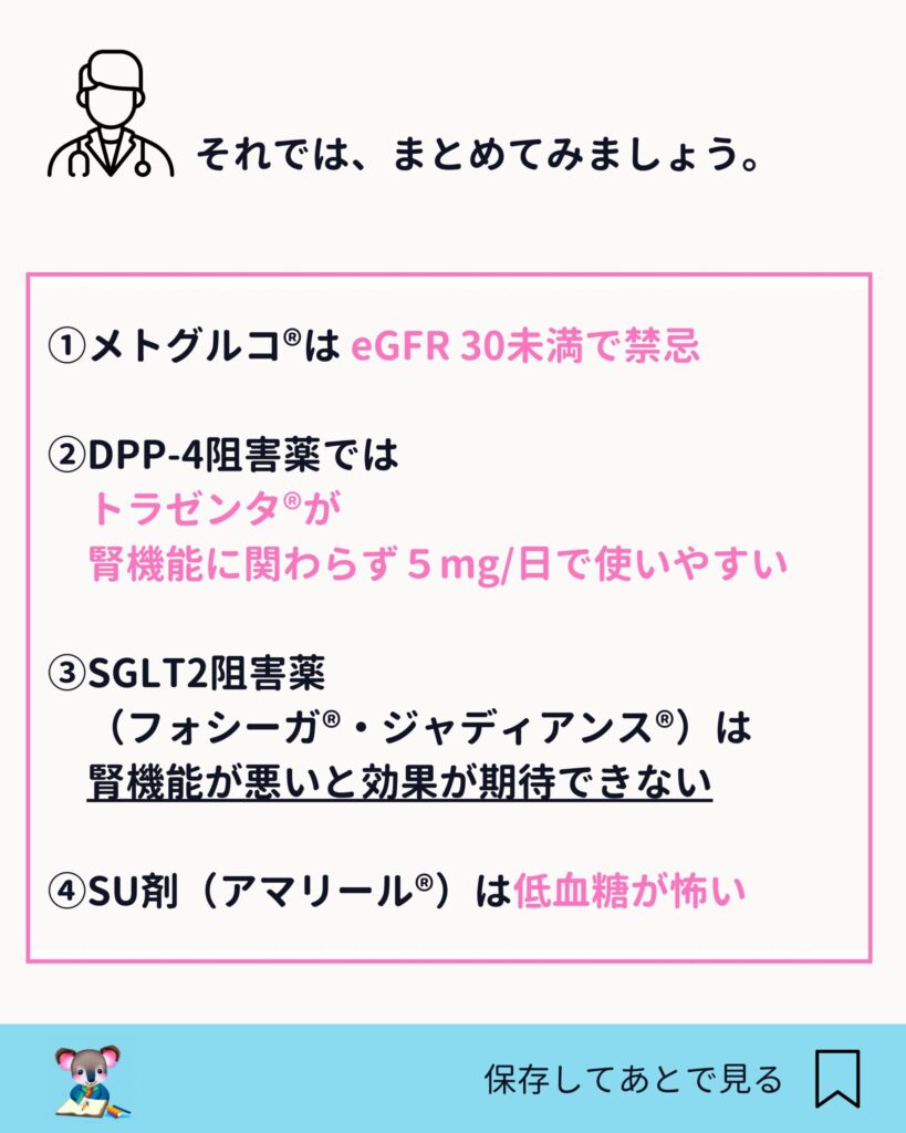 腎機能が落ちてきた患者ほど、用量設計が単純で低血糖を起こしにくい薬を選ぶ方が、結果的に安全です。