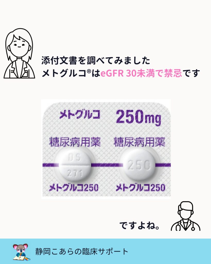 メトグルコは、eGFR30未満で禁忌と明記されています。
