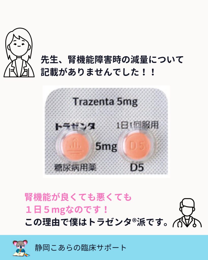 一方で、トラゼンタは腎機能に関わらず1日5mgで固定用量です。
