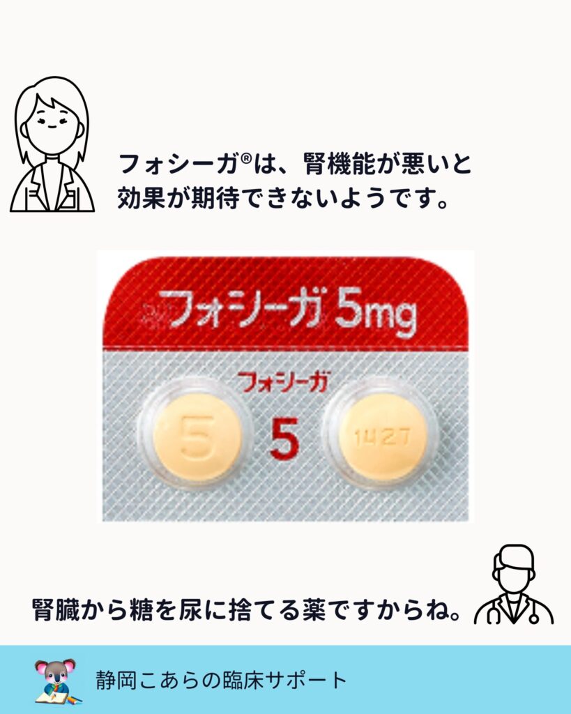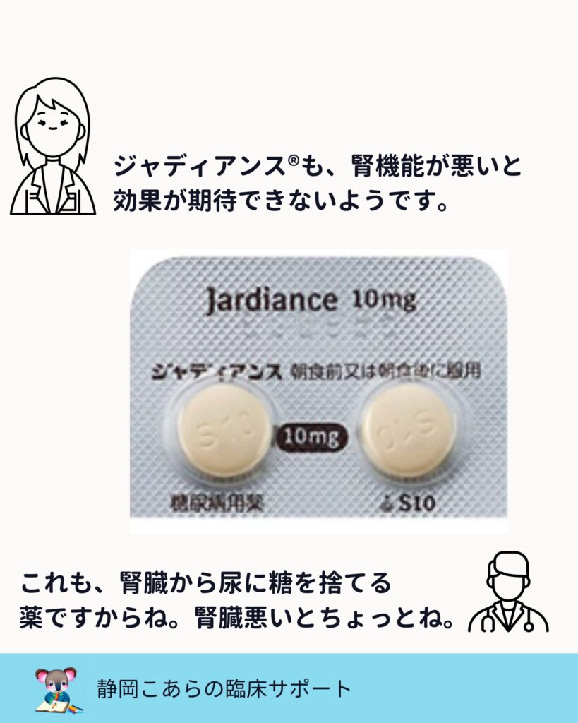 フォシーガ、ジャディアンスはいずれも、腎機能が高度に低下すると血糖降下作用は期待しにくくなります。