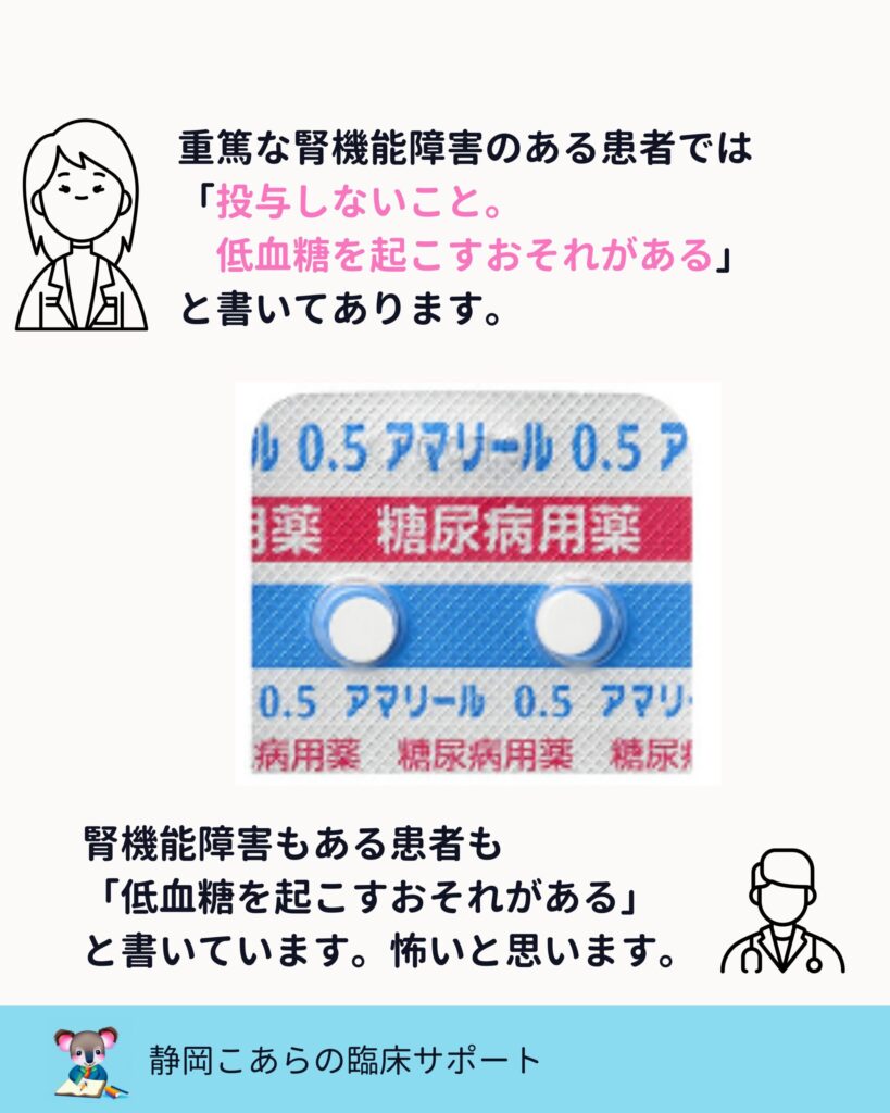 重篤な腎機能障害患者では投与しないこと、低血糖を起こすおそれがあると添付文書に記載されています。