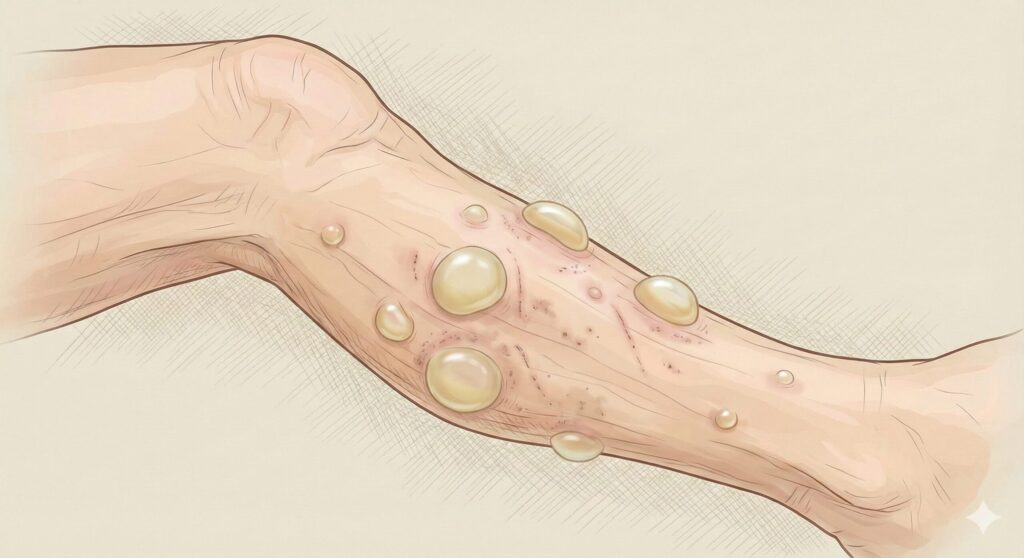 水疱性類天疱瘡の皮疹は、いくつかの特徴があります。