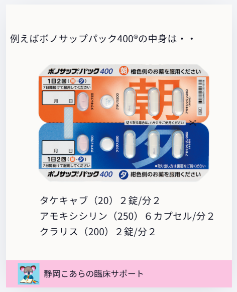 ボノサップにはクラリスロマイシン400mgと800mgがありますが、ガイドラインでは200mg×2回が基本です。そのため僕は通常「ボノサップ400」を選択しています。