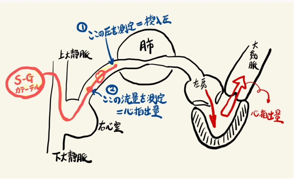 ①スワンガンツカテーテルを肺動脈まで挿入します。バルーンを膨らませて血流をストップさせ、カテーテル先端の圧モニターで測定する圧のことを「肺動脈楔入圧(せつにゅうあつ)」と言います。肺動脈楔入圧=左房圧=左心室拡張末期圧なので、つまりは心臓の前負荷を測定しているのです。