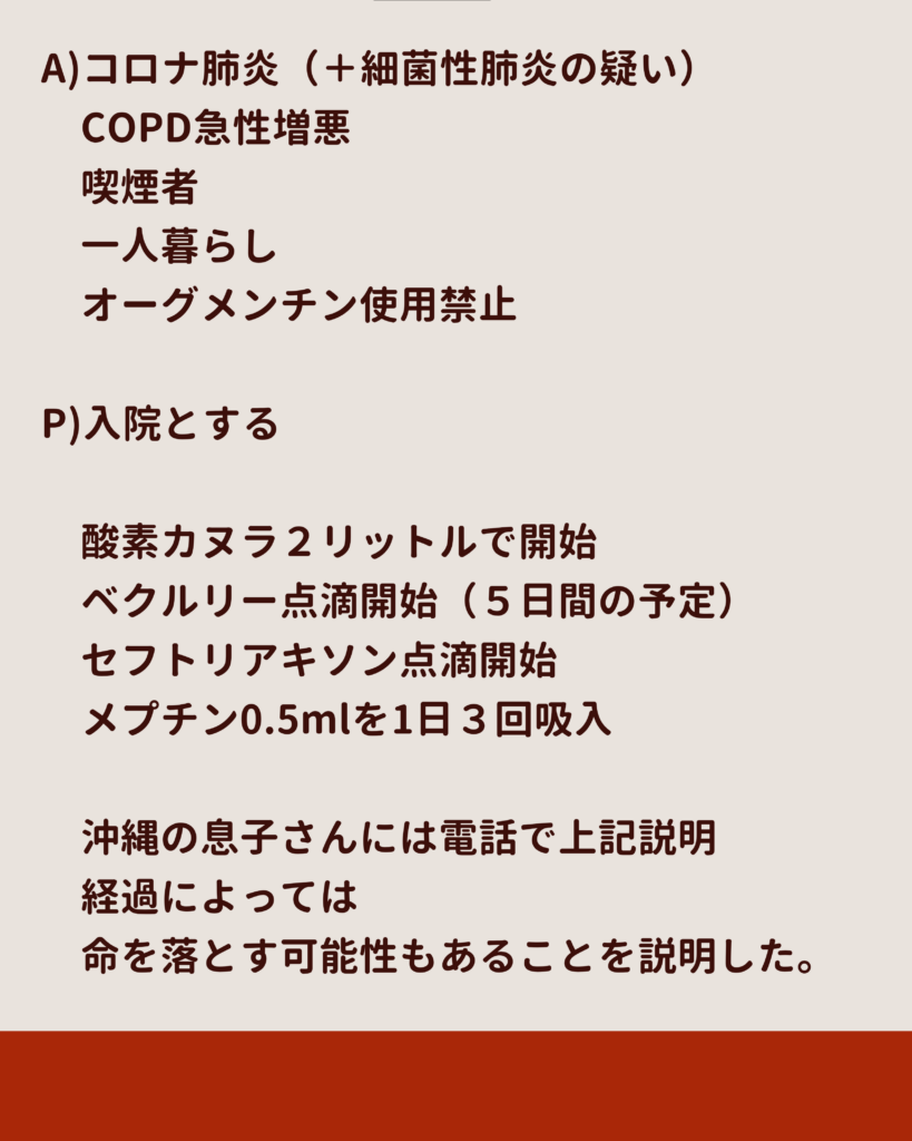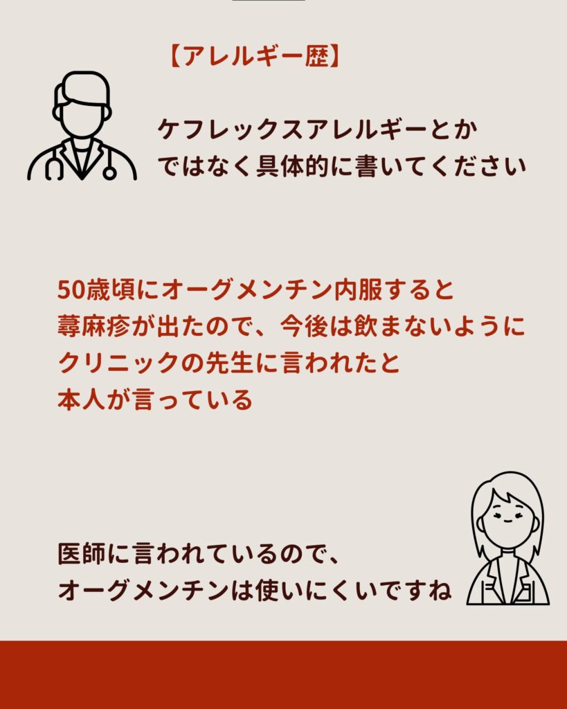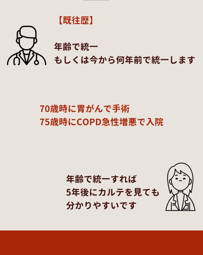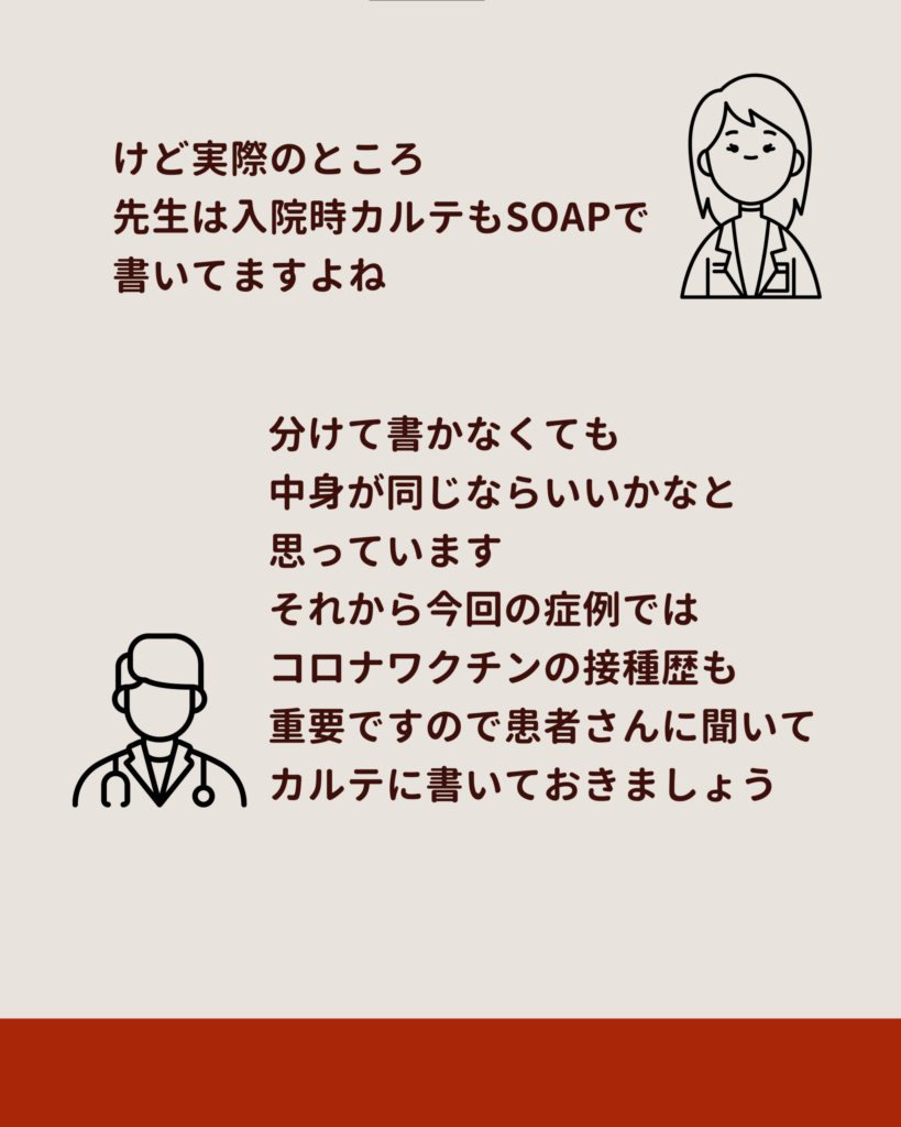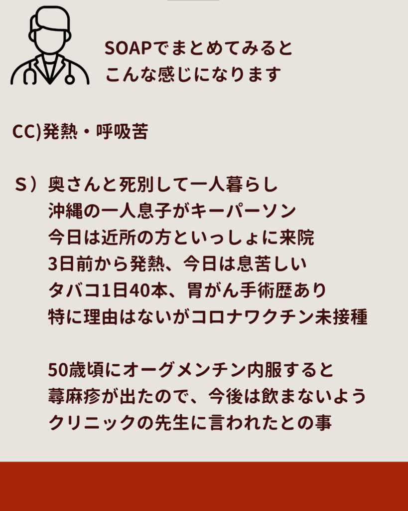主訴・現病歴・既往歴・社会歴・アレルギー・内服・身体所見・検査・診断・プランを順に整理し、SOAP形式で統合することで、誰が読んでも同じ結論にたどり着ける。