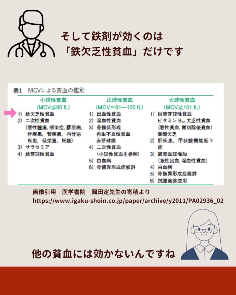 そして重要なのは――鉄剤が効くのは「鉄欠乏性貧血」だけ、という事実です。