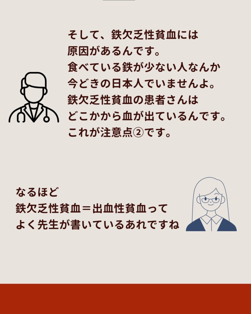 もう一つの注意点は、「鉄欠乏性貧血には必ず原因がある」ということです。