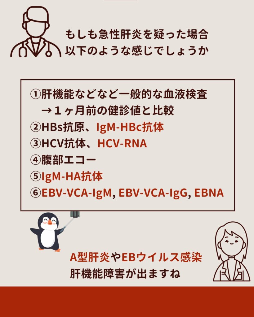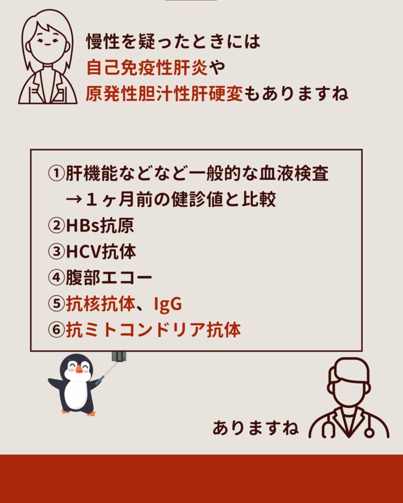 ・ウイルス性肝炎、自己免疫性肝炎、EBウイルス感染などを順に除外していく、