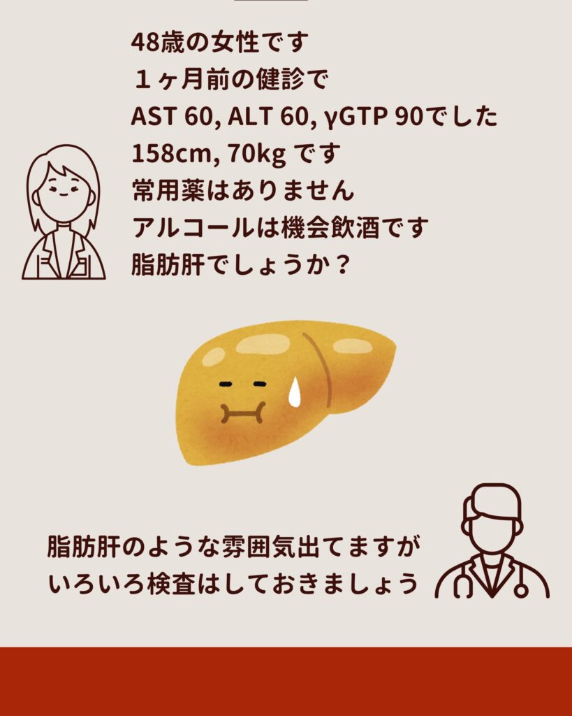 1ヶ月前の健診で AST 60, ALT 60, γ-GTP 90。