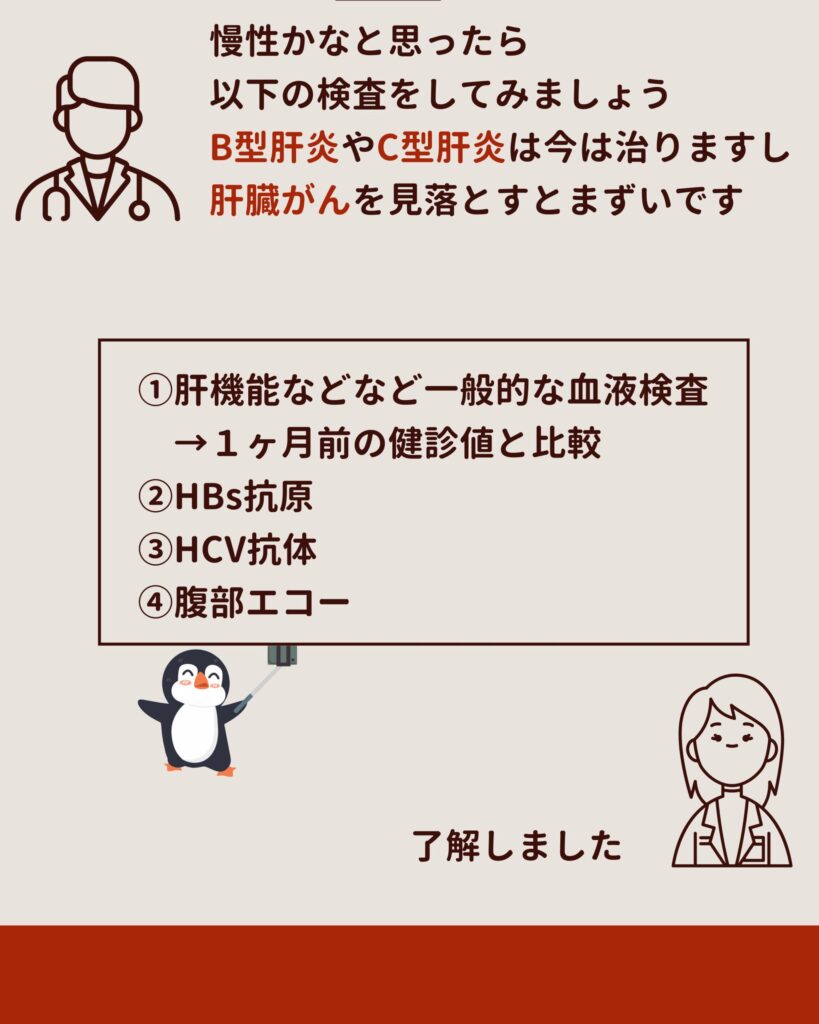 自覚症状(倦怠感、黄疸、食欲不振など)がある場合や急激な上昇が見られる場合は、