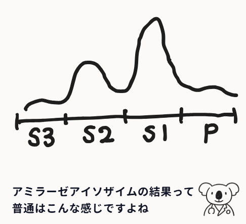 アミラーゼアイソザイムのパターンを見ると、通常はS1やS2の山がはっきり分かれていますが、マクロアミラーゼ血症では全体的にブロードに広がる形になります。