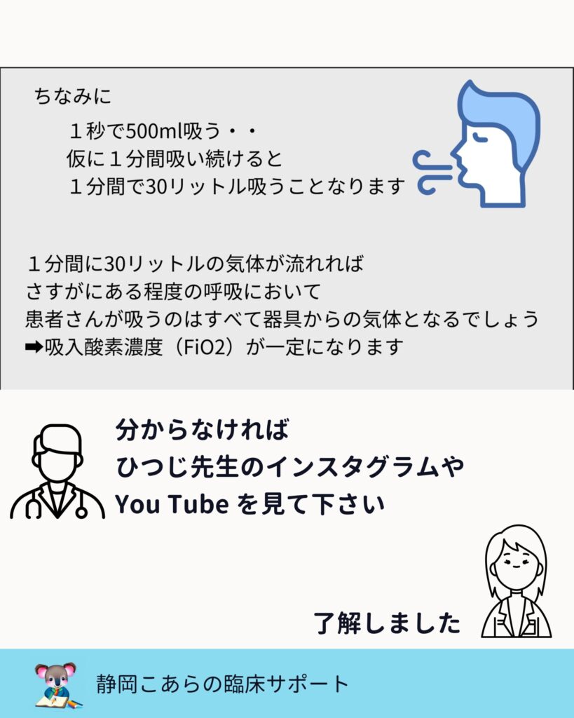 ここを理解していると、低流量でFiO₂が安定しない理由が自然と見えてきます。