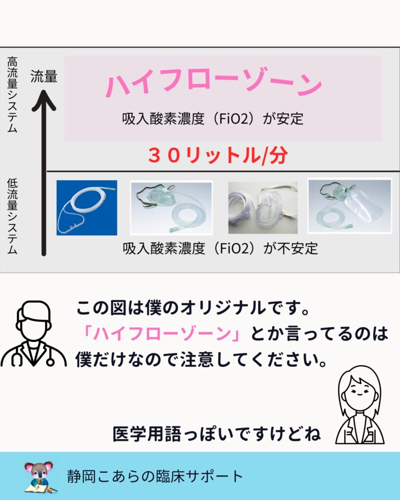 流量30L/分を境に、酸素療法が“別世界”に入るという説明は、本質を突いています。