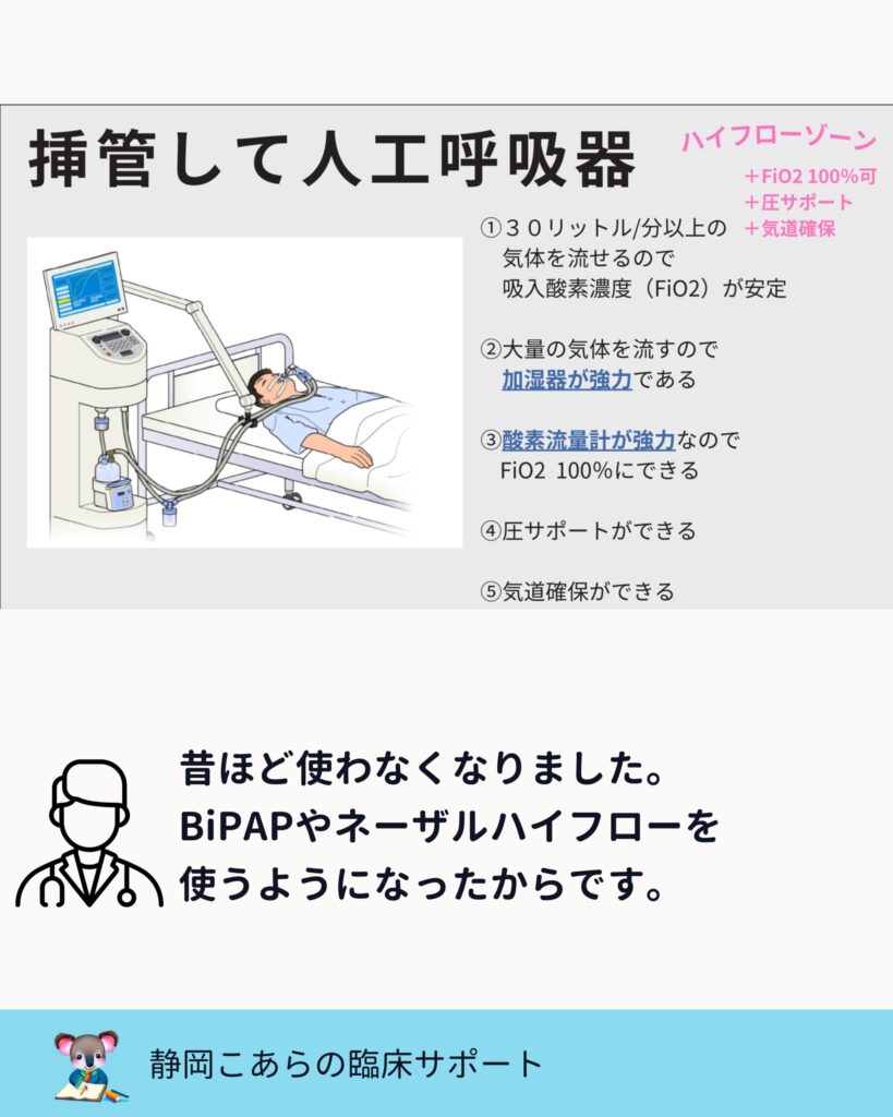 というすべてを備えていますが、近年は BiPAP やネーザルハイフローの登場で、挿管に至る症例が減ってきました。