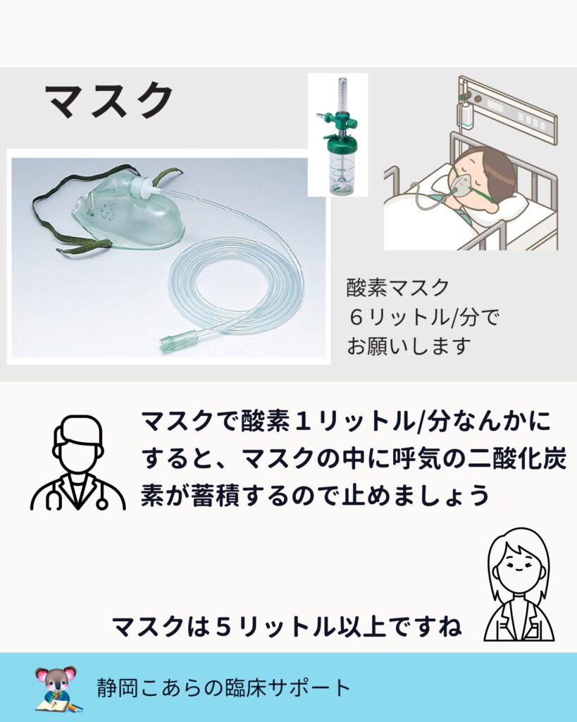 マスクで1〜2L/分の酸素を流すと、マスク内に呼気の二酸化炭素が溜まってしまいます。