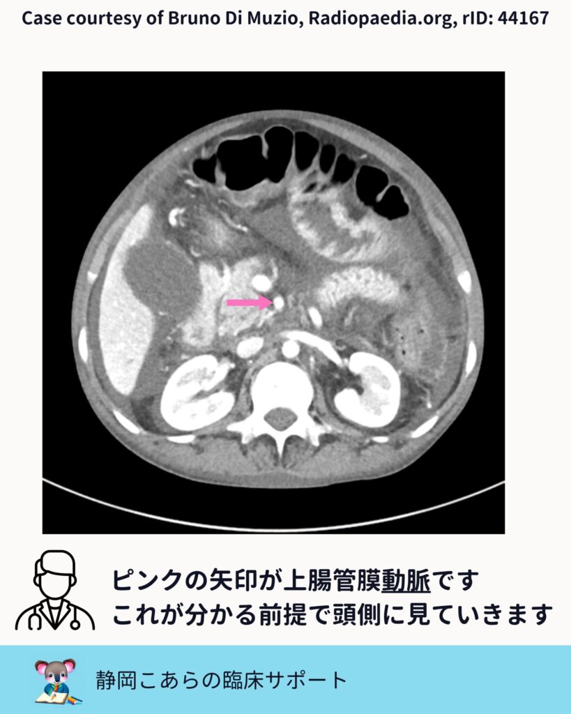 最初に確認したいのは、上腸間膜動脈です。造影CTでは、比較的早期からはっきり造影されるため、ランドマークとして非常に使いやすい存在です。