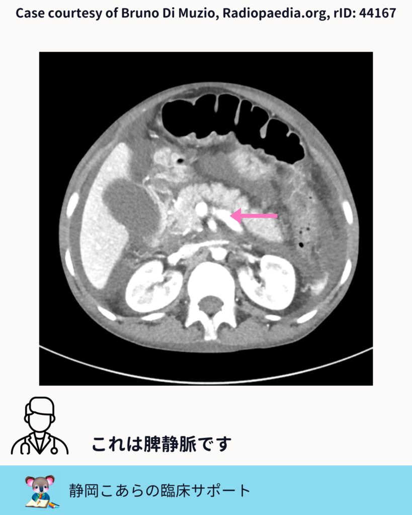 次に確認するのが脾静脈です。膵の背側を水平に走る太めの静脈で、これもCTでは比較的見つけやすい構造です。