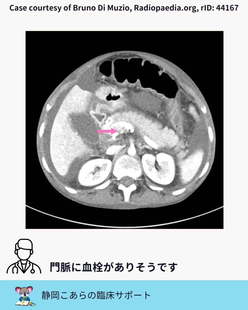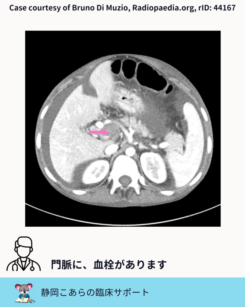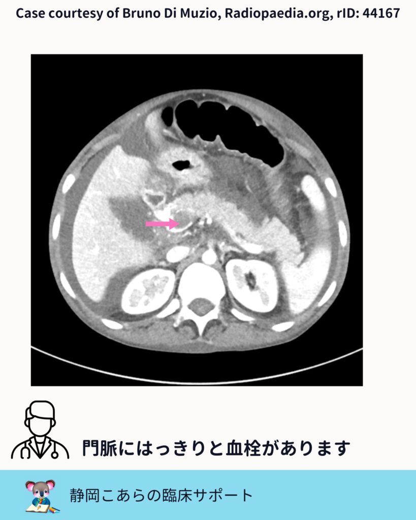 今回の症例では、門脈内に造影欠損が認められます。スライスを追うと、はっきりとした血栓として確認できます。