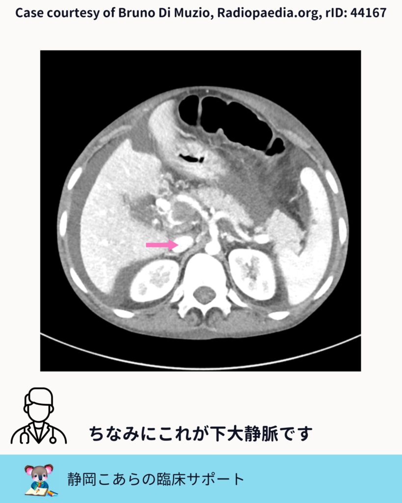 比較対象として、下大静脈も確認しておきます。位置関係と造影のされ方を見比べることで、門脈系との違いがより明確になります。