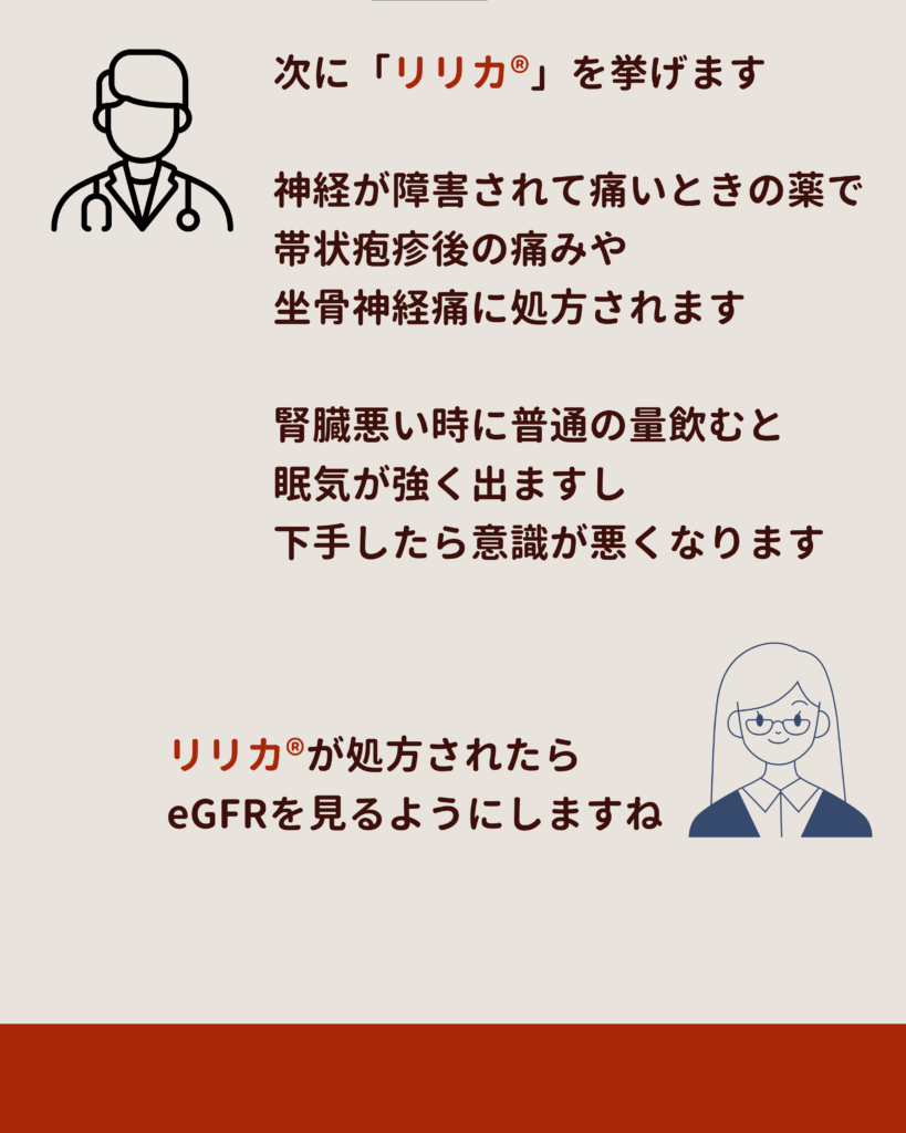 神経障害性疼痛に使われますが、腎排泄性が高く、腎機能が悪いと眠気やふらつき、意識障害を起こすことがあります。