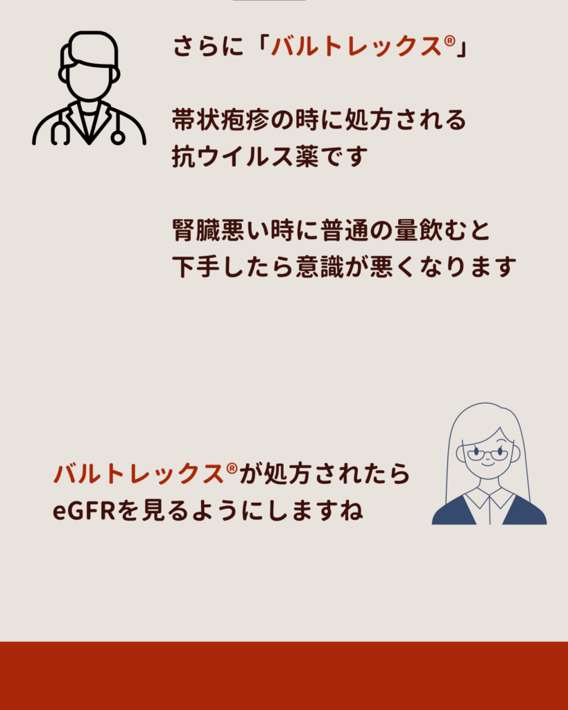 帯状疱疹などの抗ウイルス薬。腎機能低下時には蓄積して意識障害を起こすリスクがあります。