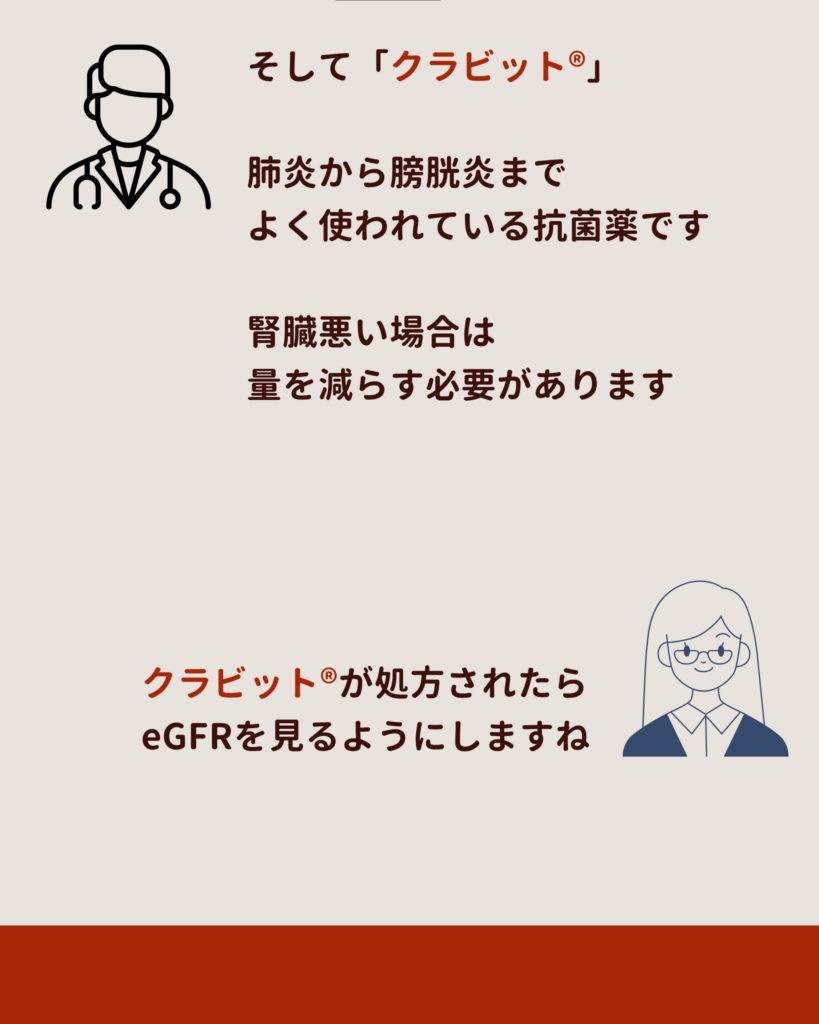 腎機能低下例では中枢性副作用(意識障害など)が出ることがあり、減量が望まれます。